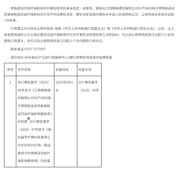 8月6日,江西信豐縣縣政府綜合部門發布了《關于江西榕閩建材有限公司年產6800噸不銹鋼制品及鋁單板制品項目環境影響評價文件審批決定》。